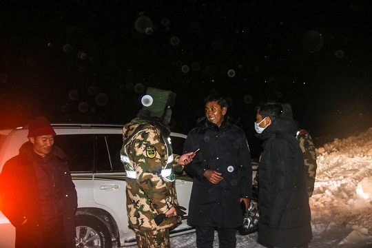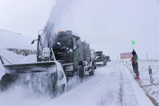 因災(zāi)害現(xiàn)場地處平均海拔4000多米以上海拔,持續(xù)降雪不斷,加之氣溫低至零下20多攝氏度,給整個道路搶通工作帶來了不少難度。為盡快清理路面積雪搶通道路,武警官兵采取“人歇機不停、分段搶通、先通后拓”的方法進行全力搶通,克服了高寒缺氧及紫外線強烈等重重困難。
