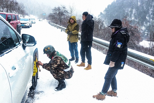 圖為武警官兵幫助滯留群眾安裝防滑鏈。