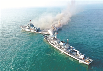 圖①:打撈救生船對“戰(zhàn)損”艦艇實施滅火救援。