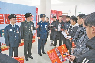 他們請(qǐng)功臣英?!鞍血?jiǎng)?wù)伦C章戴起來(lái)”,參與征兵工作。軍分區(qū)依據(jù)相關(guān)規(guī)定,制訂了佩戴獎(jiǎng)?wù)伦C章細(xì)則,規(guī)范佩戴獎(jiǎng)?wù)伦C章的類型、方法和時(shí)機(jī)。從征兵宣傳、體檢政考、役前教育訓(xùn)練,一直到審批定兵、新兵啟運(yùn)等各個(gè)環(huán)節(jié),全軍分區(qū)67名榮立過(guò)軍功的現(xiàn)役和文職人員以及所屬干休所41名戰(zhàn)功卓著的離休老干部全程參與,與預(yù)征青年面對(duì)面,講述自己的從軍經(jīng)歷、成長(zhǎng)過(guò)程和軍旅感悟。與此同時(shí),他們要求各基層武裝部在為立功受獎(jiǎng)官兵送喜報(bào)時(shí),組織預(yù)征青年代表參加,舉辦“軍功章照耀軍旅人生”主題報(bào)告會(huì)、“功臣故事分享會(huì)”等活動(dòng)。3年來(lái),這個(gè)軍分區(qū)先后舉辦80多場(chǎng)主題報(bào)告會(huì)、故事分享會(huì),以榮譽(yù)激發(fā)動(dòng)力,讓榜樣催人前行。