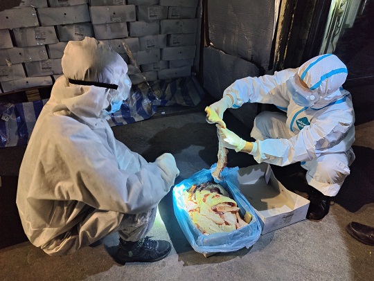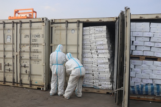 3月13日17時(shí)許,江門海警局根據(jù)情報(bào)獲悉,在江門市黃茅海對(duì)開(kāi)海域有走私活動(dòng)。該局立即派遣2艘執(zhí)法艇前往目標(biāo)海域進(jìn)行查緝。當(dāng)日18時(shí)許,該局執(zhí)法員通過(guò)AIS在目標(biāo)海域發(fā)現(xiàn)一艘可疑船只,遂即拉響警報(bào),表明身份,責(zé)令可疑船只立即停船接受檢查。在可疑船只停船后,經(jīng)執(zhí)法員登臨檢查發(fā)現(xiàn),該船舶上裝載有29個(gè)長(zhǎng)20英尺的集裝箱,集裝箱中載有大量?jī)銎罚瑑銎吠獍b上均有明顯的外文標(biāo)識(shí),由于天氣炎熱且船上沒(méi)有任何冷鏈保存裝置,部分凍品已出現(xiàn)腐敗發(fā)臭跡象,隨船未發(fā)現(xiàn)該批凍品任何合法來(lái)源和檢驗(yàn)檢疫證明,執(zhí)法員隨即將涉案船舶及所載凍品依法進(jìn)行查扣。