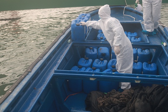 3月13日晚,廣東湛江海警局根據(jù)線報指引,在雷州市大唐電廠附近海域查獲一艘“大飛”快艇,艇上載有大量空汽油桶,隨艇未找到任何船舶證書及貨物單據(jù)。