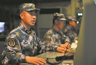 水下威脅剛解除,一場對空防御戰(zhàn)斗又緊急打響。編隊指揮室內(nèi),“敵情”態(tài)勢實時更新,一道道指令快速傳至各戰(zhàn)位。在煙幕掩護下,編隊各艦快速機動規(guī)避,組成對空防御隊形,利用副炮抗擊來襲導彈。