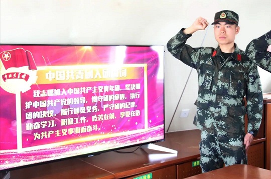 “我志愿加入中國共產(chǎn)主義青年團,堅決擁護中國共產(chǎn)黨的領(lǐng)導(dǎo)……”“就在今天,我光榮地加入了中國共產(chǎn)主義青年團,成為其中一份子。在今后的的訓(xùn)練工作中,我會更加努力刻苦,嚴格要求自己,把青春夢想融入海疆,立足本職崗位,以青春的名義,志存高遠,腳踏實地,讓自己的青春綻放光彩”。