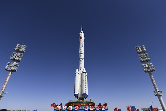 白色的長征二號(hào)F遙十四運(yùn)載火箭,靜靜矗立在藍(lán)色發(fā)射塔架旁。