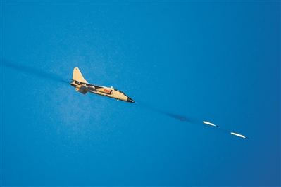 圖①:北部戰(zhàn)區(qū)海軍航空兵某旅組織戰(zhàn)術(shù)射擊訓(xùn)練,檢驗(yàn)飛行員低空機(jī)動(dòng)突防能力。圖為戰(zhàn)機(jī)俯沖向目標(biāo)發(fā)射火箭彈。張?jiān)?攝