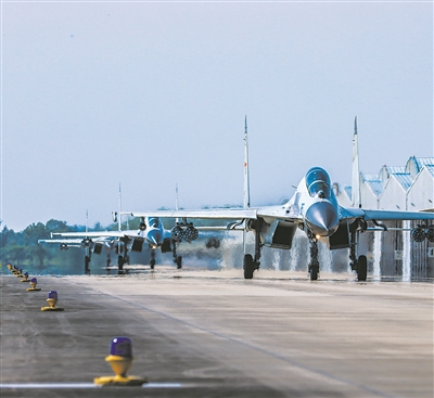 “計時起飛!”上午6時許,隨著指揮員一聲令下,數(shù)架戰(zhàn)機依次滑出起飛,在空中集結(jié)后飛赴靶場空域。