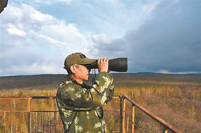 一架望遠鏡、一部對講機、一張地圖,在4平方米的瞭望臺上,黑龍江省湯旺縣民兵瞭望員胥魯新守護著方圓40多公里的山林。