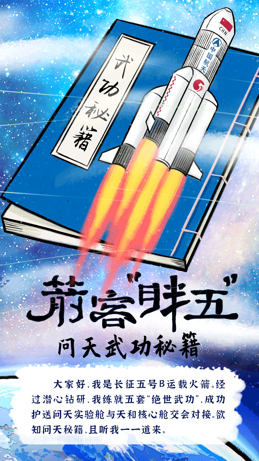 大家好,我是長征五號B運載火箭。經(jīng)過潛心鉆研,我練就五套“絕世武功”,成功護送問天實驗艙與天和核心艙交會對接。欲知問天秘籍,且聽我一一道來。