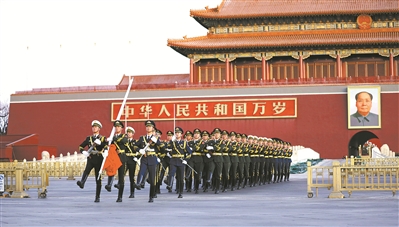 每天,伴著晨曦,解放軍儀仗大隊(duì)官兵在天安門廣場(chǎng)升起國旗,為祖國和人民迎接黎明。黃昏時(shí)分,年輕的軍人們穿過天安門城樓券門時(shí)唱起:我把青春融進(jìn)祖國的江河……