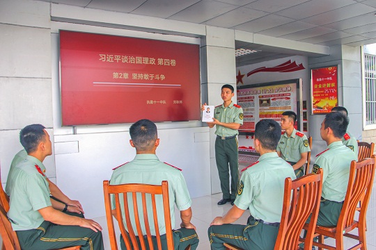 圖為官兵通過(guò)開(kāi)展讀書(shū)交流會(huì)學(xué)習(xí)《習(xí)近平談治國(guó)理政》第四卷。