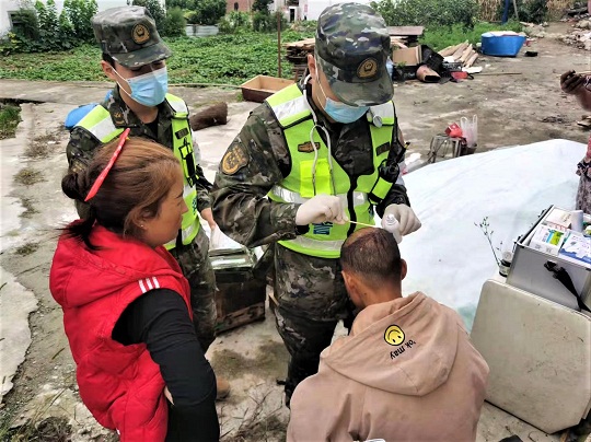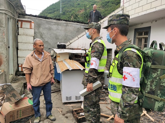 圖為武警官兵為受災(zāi)群眾開展醫(yī)療巡診工作。
