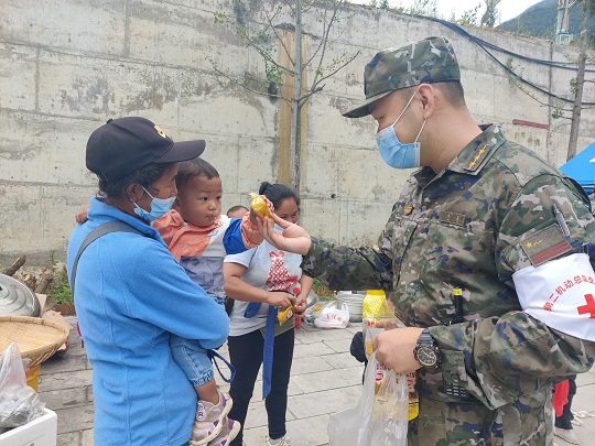 圖為武警官兵為受災(zāi)群眾分發(fā)食物和水。