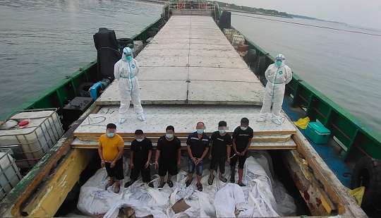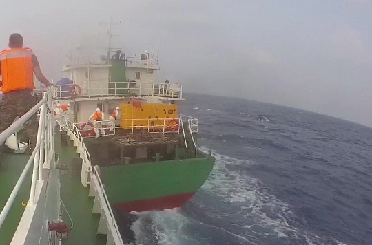 當(dāng)日7時55分,海上風(fēng)浪較大,執(zhí)法艇與前來增援的多艘執(zhí)法艇一起對其進(jìn)行圍堵攔截,在執(zhí)法艇與該嫌疑船船尾相靠瞬間,執(zhí)法員找準(zhǔn)時機(jī)對其進(jìn)行強制跳幫,并強行控制目標(biāo)船只,現(xiàn)場查控嫌疑人6名。