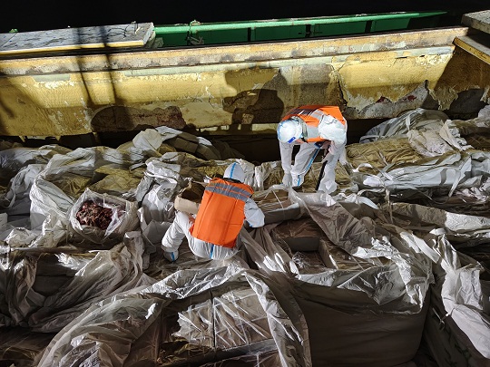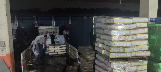 經(jīng)查,該嫌疑船艙內(nèi)滿裝大量白色編制袋貨物一批,經(jīng)開箱查驗,發(fā)現(xiàn)箱內(nèi)裝有涉嫌走私雪花牛肉、牛黃喉、牛百葉等來源不明凍品,共約200余噸。隨船人員均未能提供船舶證件及該批貨物合格來源相關(guān)證明,隨即執(zhí)法員依法對涉案船舶及所載凍品進(jìn)行查扣。