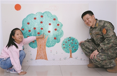 在張威偉家的墻上,畫著一棵蘋果樹。不知從哪天起,蘋果樹旁又“長”出一棵小蘋果樹。女兒說,爸爸表現(xiàn)好,她就用紅紙剪一個蘋果貼在上面;表現(xiàn)不好,蘋果樹上就會長出藍色的蘋果。