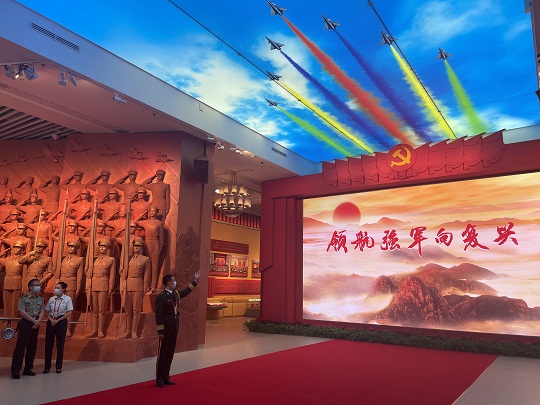 圖為“領(lǐng)航強(qiáng)軍向復(fù)興——新時(shí)代國防和軍隊(duì)建設(shè)成就展”展廳。