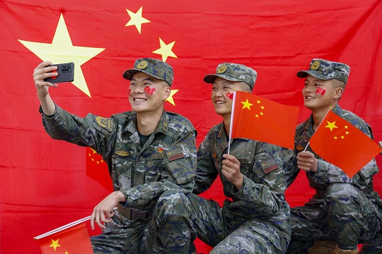 圖為官兵與國旗合影。李豪 攝