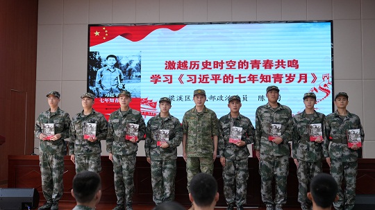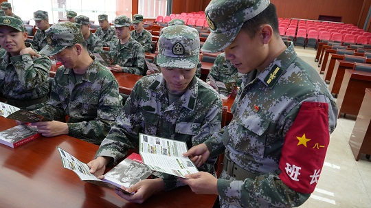 圖為向新兵發(fā)放一本書籍。