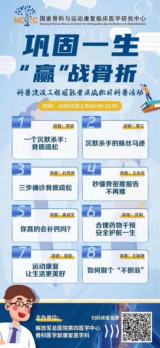 本報訊 見習(xí)記者韓瀟 通訊員李曉 石秀秀 10月20日,是世界衛(wèi)生組織確立的“國際骨質(zhì)疏松日”,今年中國的主題是“鞏固一生,贏戰(zhàn)骨折”。解放軍總醫(yī)院第四醫(yī)學(xué)中心骨科醫(yī)學(xué)部康復(fù)醫(yī)學(xué)科充分利用國家骨科與運動康復(fù)臨床醫(yī)學(xué)研究中心平臺,即骨科與運動康復(fù)領(lǐng)域唯一的國家級臨床醫(yī)學(xué)研究中心,在“科普建設(shè)工程”版塊開展線上科普宣傳活動。活動中,共有1萬余名患者及家屬登陸直播間觀看。這是該醫(yī)學(xué)部貫徹落實“健康中國2030發(fā)展綱要”的實際行動,目的是關(guān)注全國軍民各個年齡段骨骼健康,引導(dǎo)遠離骨質(zhì)疏松危害,降低發(fā)生脆性骨折的風(fēng)險,提高健康生活質(zhì)量。