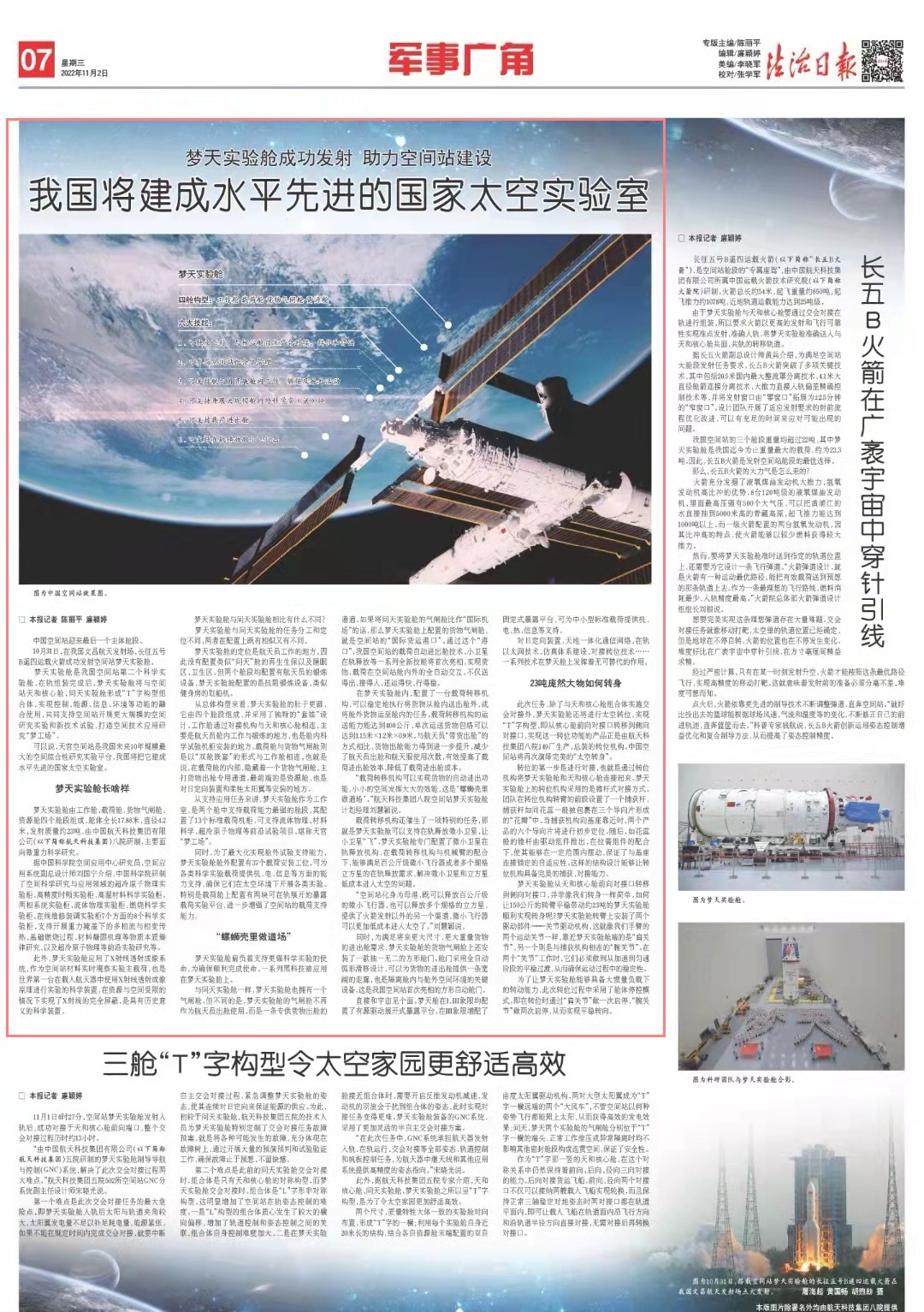 夢天實驗艙是我國空間站第二個科學實驗艙,在軌組裝完成后,夢天實驗艙將與空間站天和核心艙、問天實驗艙形成“T”字構型組合體,實現控制、能源、信息、環(huán)境等功能的融合使用,共同支持空間站開展更大規(guī)模的空間研究實驗和新技術試驗,打造空間技術應用研究“夢工場”。