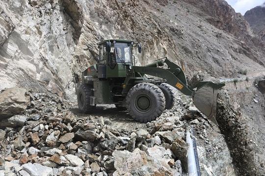 2021年8月,中隊官兵在“嘎瑪溝”搶險。險峻的山、狹窄的路,加上連日雨水侵蝕,現(xiàn)場危機四伏,導致無法展開多機協(xié)同作業(yè)。官兵們根據(jù)現(xiàn)場情況,采取先通后拓的方法很快取得實效??烧敁屝薰ぷ黜樌M行時,突然一塊巨石從塌方點上側(cè)掉落,安全員李發(fā)立即吹響哨子,并舉旗示意迅速撤離。由于提醒及時,最終無車輛人員受損。裝載機操作手李亞東說:“要不是安全員提醒及時,機械和人都會被砸進怒江,后果不堪設(shè)想?!?/p>