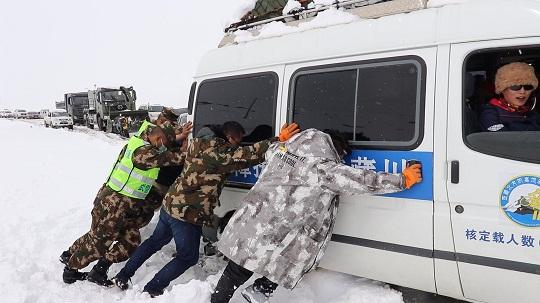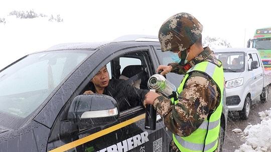 如果說夏秋兩季是和土石做斗爭,那冬春季就是和冰雪搶地盤。每年11月至次年4月,養(yǎng)護路段平均積雪深20厘米,暗冰也有10厘米厚。2021年4月,連夜降雪導致一臺電建部門的車輛陷入邊溝,亟待救援。中隊接到命令后,立即準備熱水、干糧、大衣等物資前往事發(fā)地,因天氣條件惡劣、施工道路狹窄,大型裝備無法展開,導致救援工作異常緩慢。官兵們在零下10攝氏度的低溫條件下,肩扛手刨,連續(xù)奮戰(zhàn)6個小時,硬是將失事車輛抬出邊溝。任務(wù)結(jié)束后,不少人凍得滿臉青紫,連話都說不出來。