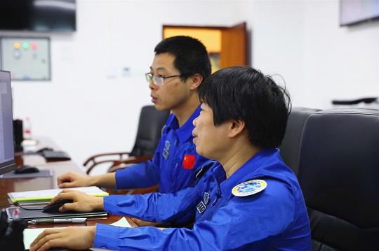 氣象室內(nèi),高級(jí)工程師甘思舊正和團(tuán)隊(duì)對(duì)多類氣象數(shù)據(jù)進(jìn)行分析,為此次發(fā)射觀云測(cè)雨,全力保障任務(wù)圓滿成功。