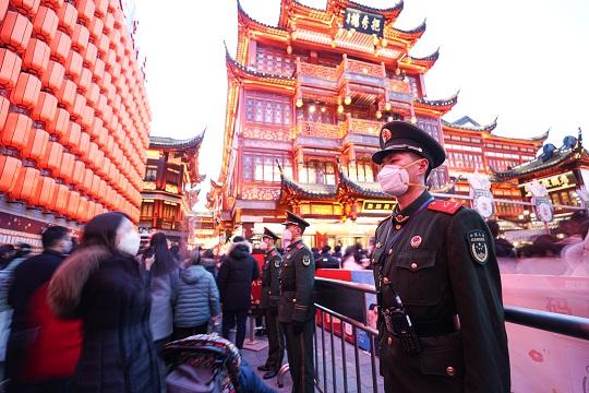 2月5日元宵佳節(jié),上海豫園張燈結(jié)彩、美輪美奐,一年一度的國家級非物質(zhì)文化遺產(chǎn)項目上海豫園新春民俗藝術燈會在此舉辦。節(jié)日恰逢周末,賞燈游園人群摩肩接踵。花燈下,武警上??傟牂C動第一支隊官兵堅守崗位,默默守護群眾平安賞燈。