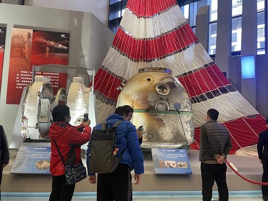 圖為參觀者觀看神舟十三號返回艙實物。