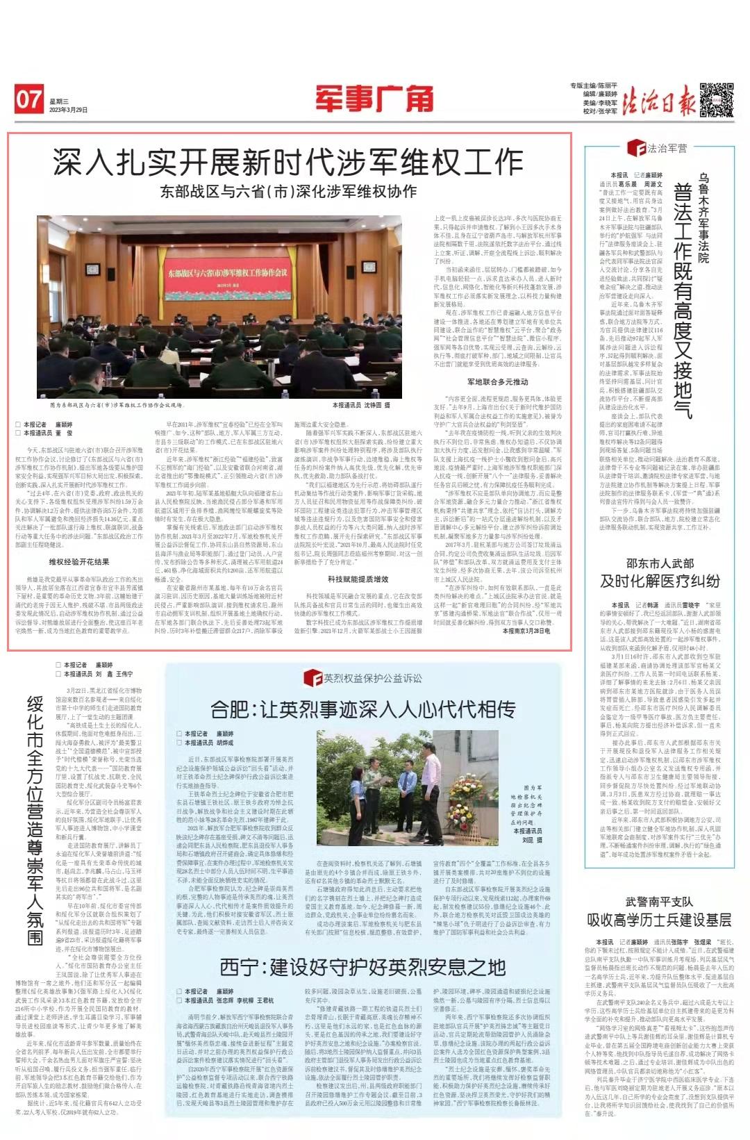 今天,東部戰(zhàn)區(qū)與駐地六?。ㄊ校┞?lián)合召開涉軍維權(quán)工作協(xié)作會(huì)議,討論修訂了《東部戰(zhàn)區(qū)與六?。ㄊ校┥孳娋S權(quán)工作協(xié)作機(jī)制》,提出軍地各級(jí)要從維護(hù)國家安全利益、實(shí)現(xiàn)強(qiáng)軍興軍目標(biāo)大局出發(fā),積極探索、創(chuàng)新實(shí)踐,深入扎實(shí)開展新時(shí)代涉軍維權(quán)工作。