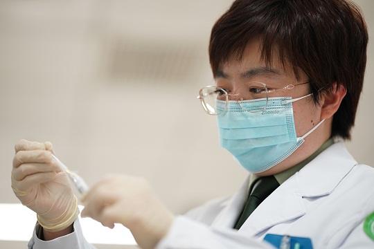 圖為武警特色醫(yī)學(xué)中心檢驗(yàn)科主管技師劉持佳正在提取患者血清。程壯壯 攝
