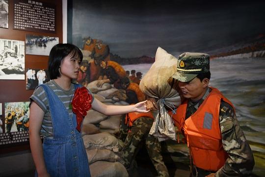 圖為武警工程大學(xué)學(xué)員萬鴻玥在武警安徽總隊(duì)合肥支隊(duì)史館父親萬四海的雕像旁緬懷追思。徐偉 攝