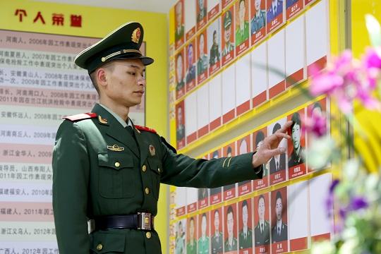 圖為清明節(jié)前夕,武警浙江總隊(duì)金華支隊(duì)執(zhí)勤二中隊(duì)二級上士何浩在中隊(duì)榮譽(yù)室緬懷父親何章法。慕仲驊 攝