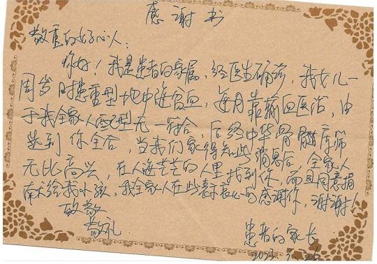 和200毫升造血干細(xì)胞混懸液一同送到患者身邊的,還有一封文濤寫的信,他希望小女孩早日恢復(fù)健康,擁有一顆溫暖的心和一個(gè)美好的未來。