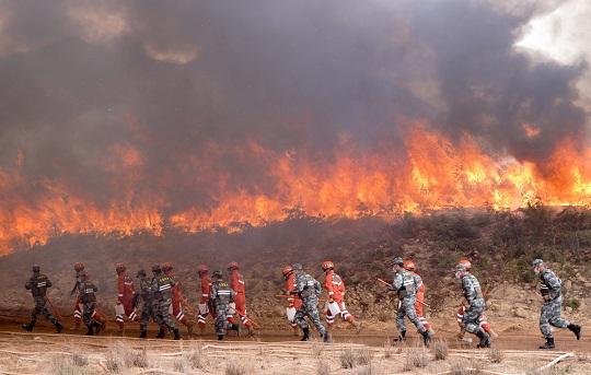 圖為武警麗江支隊(duì)官兵和麗江軍分區(qū)民兵奔赴火場(chǎng)參與滅火。欒鋮 攝