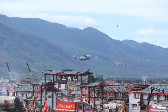 圖為直升機(jī)突入“災(zāi)區(qū)”。