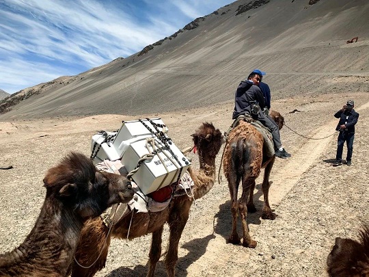 由于安裝地點沒有道路,而且需要翻越四千多米雪山,于是大家就雇了8匹駱駝將物資和儀器運至目的地。隨著海拔升高,大家的高原反應(yīng)越來越明顯。張朝說,大家陸續(xù)感到頭痛欲裂、呼吸困難、惡心嘔吐……但是誰也不敢休息,相互攙扶或是輪流著駱駝,緩慢向山頂推進(jìn),只為趕在天黑前到達(dá)目的地。