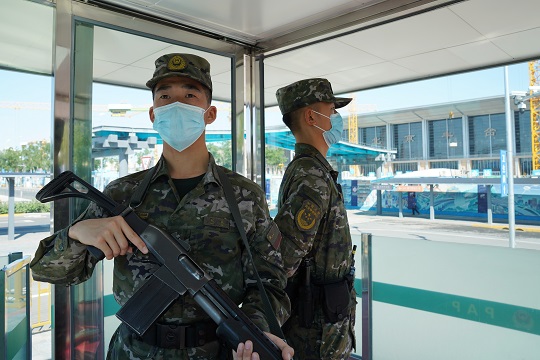 圖為烈日下,武警官兵在認真執(zhí)勤。