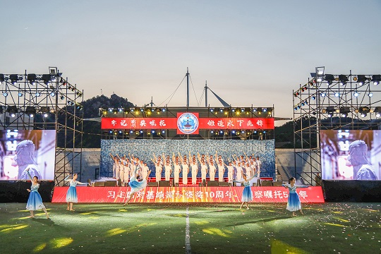 隨著音樂緩緩響起,來自援建單位湖北十八洞村八一愛民學(xué)校學(xué)生走上舞臺,與官兵齊聲合唱《不忘初心》。