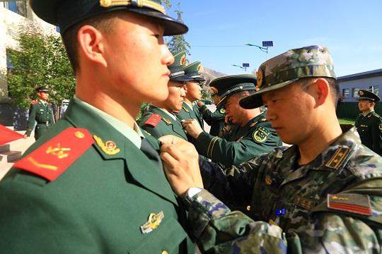 圖為武警青海總隊黨員干部為新黨員佩戴黨徽。李懿軒 攝