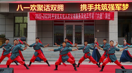 本次活動由武警青??傟犖乃囕p騎兵、青海省演藝集團、海西歌舞團等進行表演。文藝演出在雄壯震撼的歌舞《向著偉大的夢想》中拉開帷幕,情景表演唱《祖國召喚,我喊到》、舞蹈《追風》《我的鐵甲夢》、紅歌聯(lián)唱《十送紅軍》《英雄贊歌》《不忘初心》、音樂快板《強軍征程新風貌》、馬頭琴演奏《草原歡歌》、川劇《變臉》等節(jié)目輪番上演。
