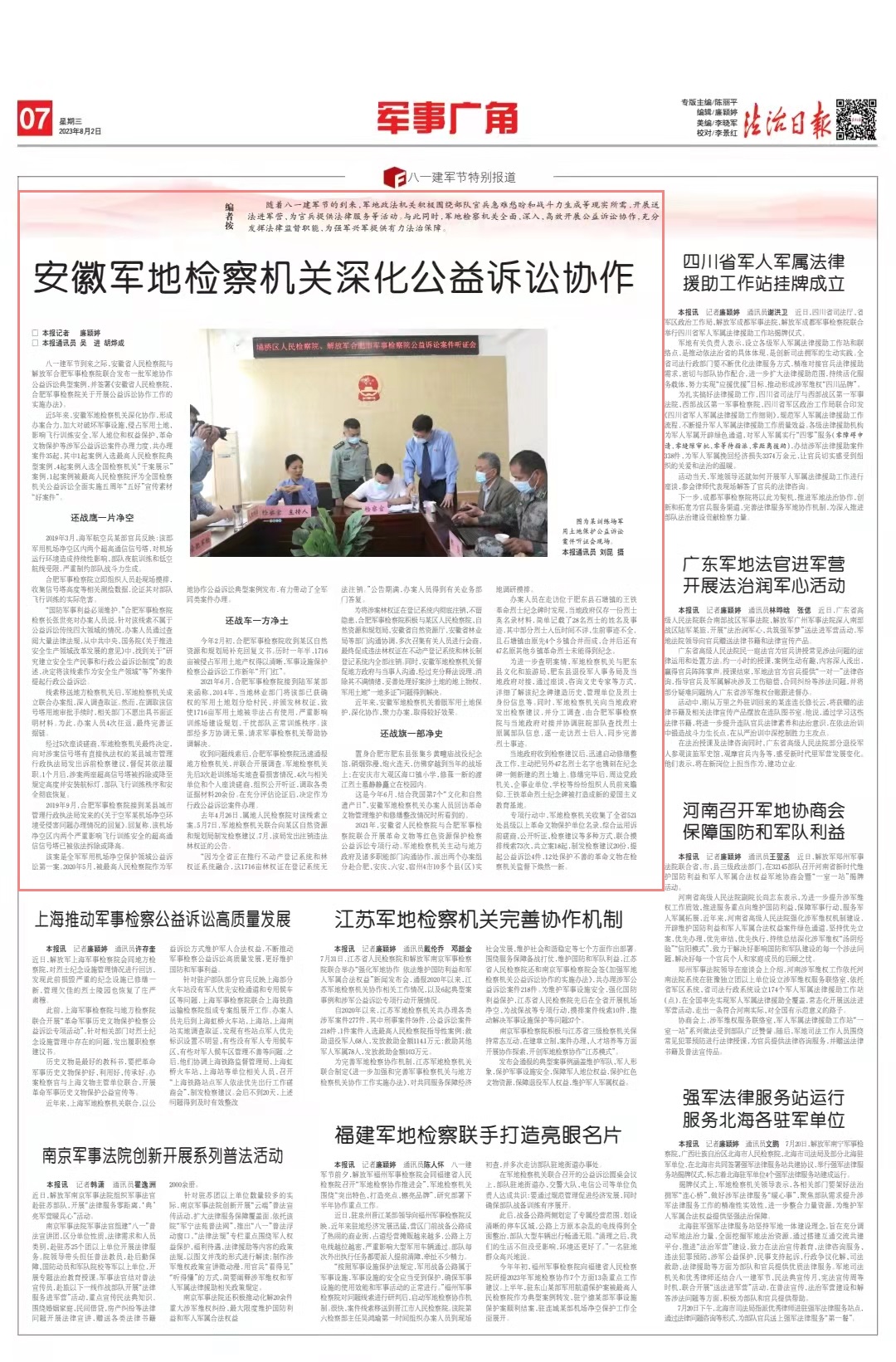 八一建軍節(jié)到來(lái)之際,安徽省人民檢察院與解放軍合肥軍事檢察院聯(lián)合發(fā)布一批軍地協(xié)作公益訴訟典型案例,并簽署《安徽省人民檢察院、合肥軍事檢察院關(guān)于開(kāi)展公益訴訟協(xié)作工作的實(shí)施辦法》。