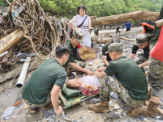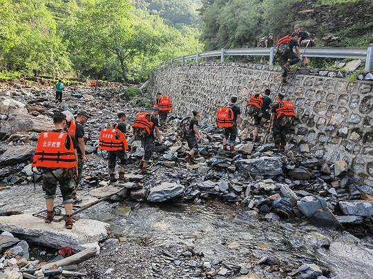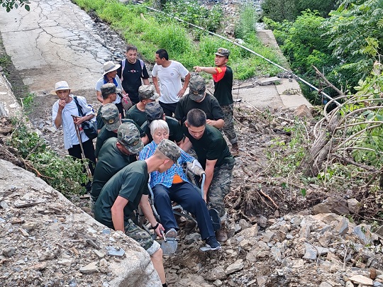 8月4日,由于道路被沖毀,北京市房山區(qū)史家營(yíng)鄉(xiāng)多個(gè)自然村斷水?dāng)嚯?,物資緊缺,武警北京總隊(duì)機(jī)動(dòng)第二支隊(duì)緊急出動(dòng)300余人,山區(qū)徒步40公里,人均負(fù)重30千克,將村民緊缺的食物,藥品,飲水送至村民手中,并轉(zhuǎn)運(yùn)重傷災(zāi)民、老人8人。