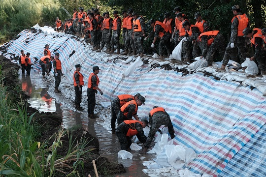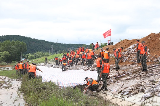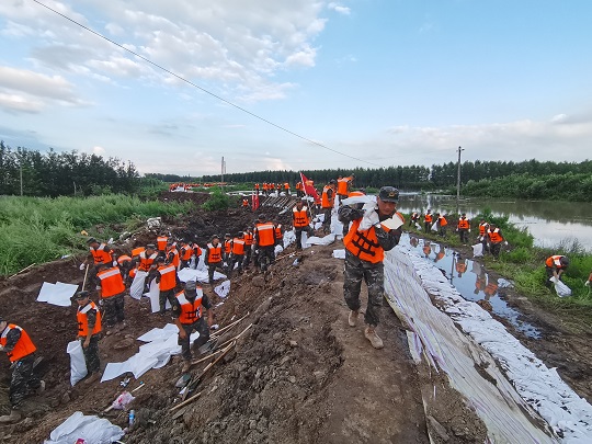 8月9日,武警黑龍江總隊出動500余名官兵對哈爾濱、牡丹江等地河流堤壩進行防水加固。