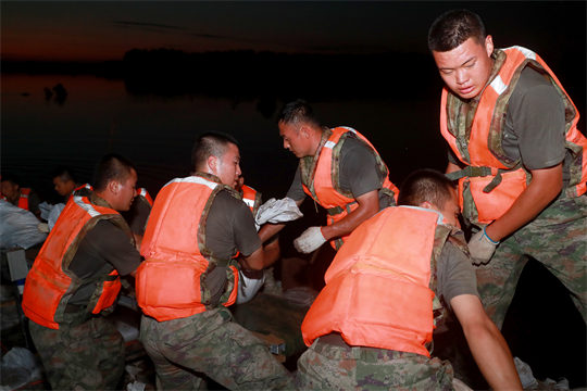 圖為北部戰(zhàn)區(qū)陸軍某旅成立黨員突擊隊,在吉林省扶余市弓棚子鎮(zhèn)拉林河楊家崴子段封堵決口。李朝陽 攝