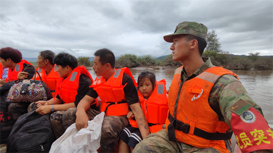 圖為北部戰(zhàn)區(qū)陸軍某旅黨員突擊隊在哈爾濱市五常市沙河子鎮(zhèn)大貴村利用沖鋒舟轉(zhuǎn)移受困群眾。王麒淞 攝