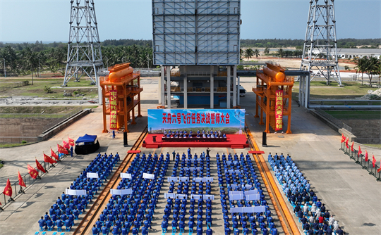 在文昌航天發(fā)射場,每次發(fā)射前都有一項(xiàng)特殊的“出征儀式”——火箭垂直轉(zhuǎn)運(yùn)。航天人深情凝望火箭活動發(fā)射平臺上的鮮紅國旗和動員標(biāo)語,揮舞黨旗、唱響紅歌、誓師動員……這項(xiàng)特殊的儀式,見證著祖國航天事業(yè)的騰飛,也為重大航天發(fā)射任務(wù)注入不竭的精神動力。
