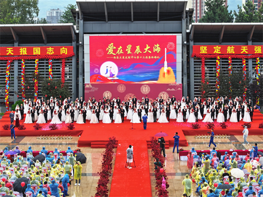 “星辰大海,夢(mèng)想自有夢(mèng)想的力量,仰望在銀河的想象,我們起航……”活動(dòng)最后,全體新人與觀禮人員共同合唱《星辰大?!?。愛在星辰大海,新人們把愛的誓言唱響在航天大院,幸福的歌聲在青山之間久久回蕩……