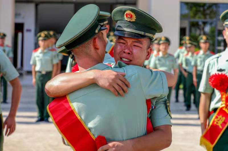 8月30日上午,宣布士兵退役命令,熟悉的戰(zhàn)友親手為退役老兵們卸下同自己摸爬滾打幾年的軍銜。走留戰(zhàn)友彼此緊緊相擁,淚水瞬間模糊了雙眼。